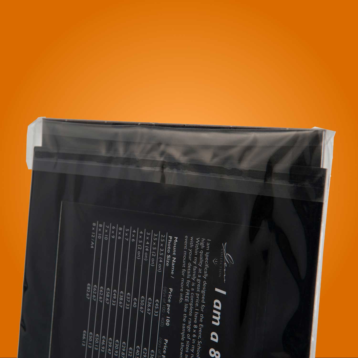 Resealable clear bags for 8 x 10 overall size mats or 8 x 10 prints. Made from thick polypropylene with resealable tape on lip, these bags are widely recyclable under code 5 PP.