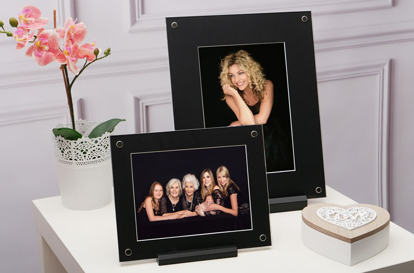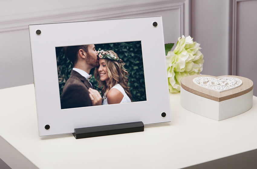 The base of the frame is made from a piano black acrylic as is the back panel of the frame. The front panel is made from a clear acrylic and there are 4 silver magnets, one in each corner which holds the panels securely together. The magnetic system makes it super quick and easy to change the image inside. The frame can be easily rotated to display in both landscape and portrait orientations.