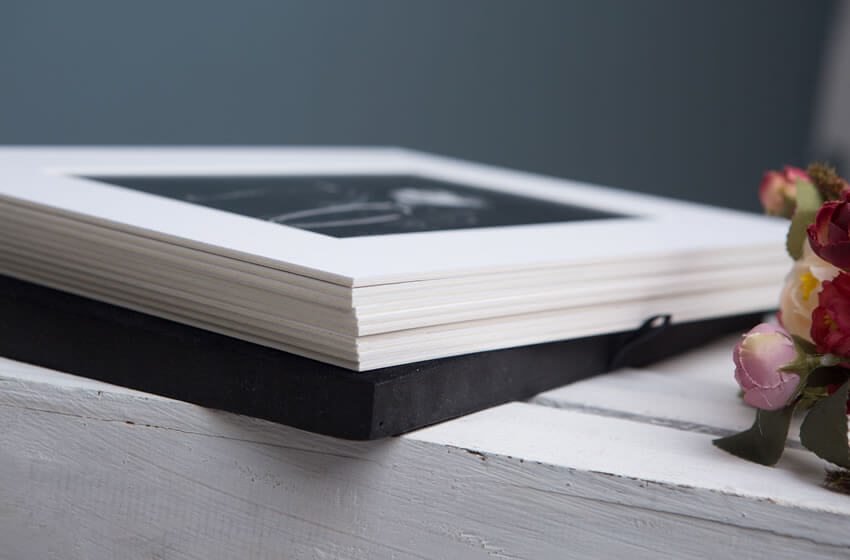 The standard mounts are pre-assembled bevel cut mats that are open on 2 sides so you just need to slide your prints in. The front board is made from the same professional Conservation board as our Ultimate mats.